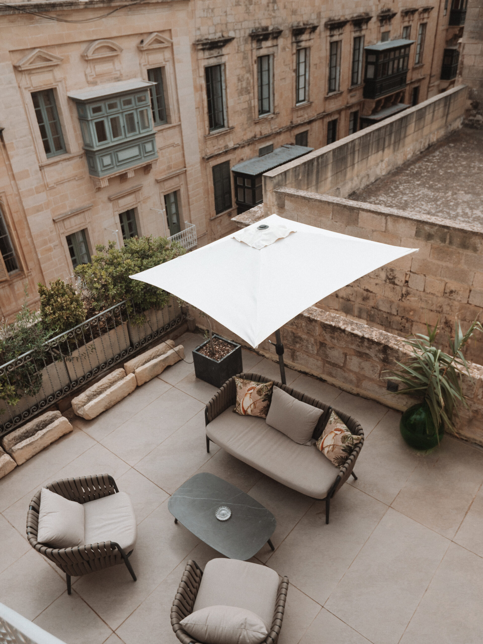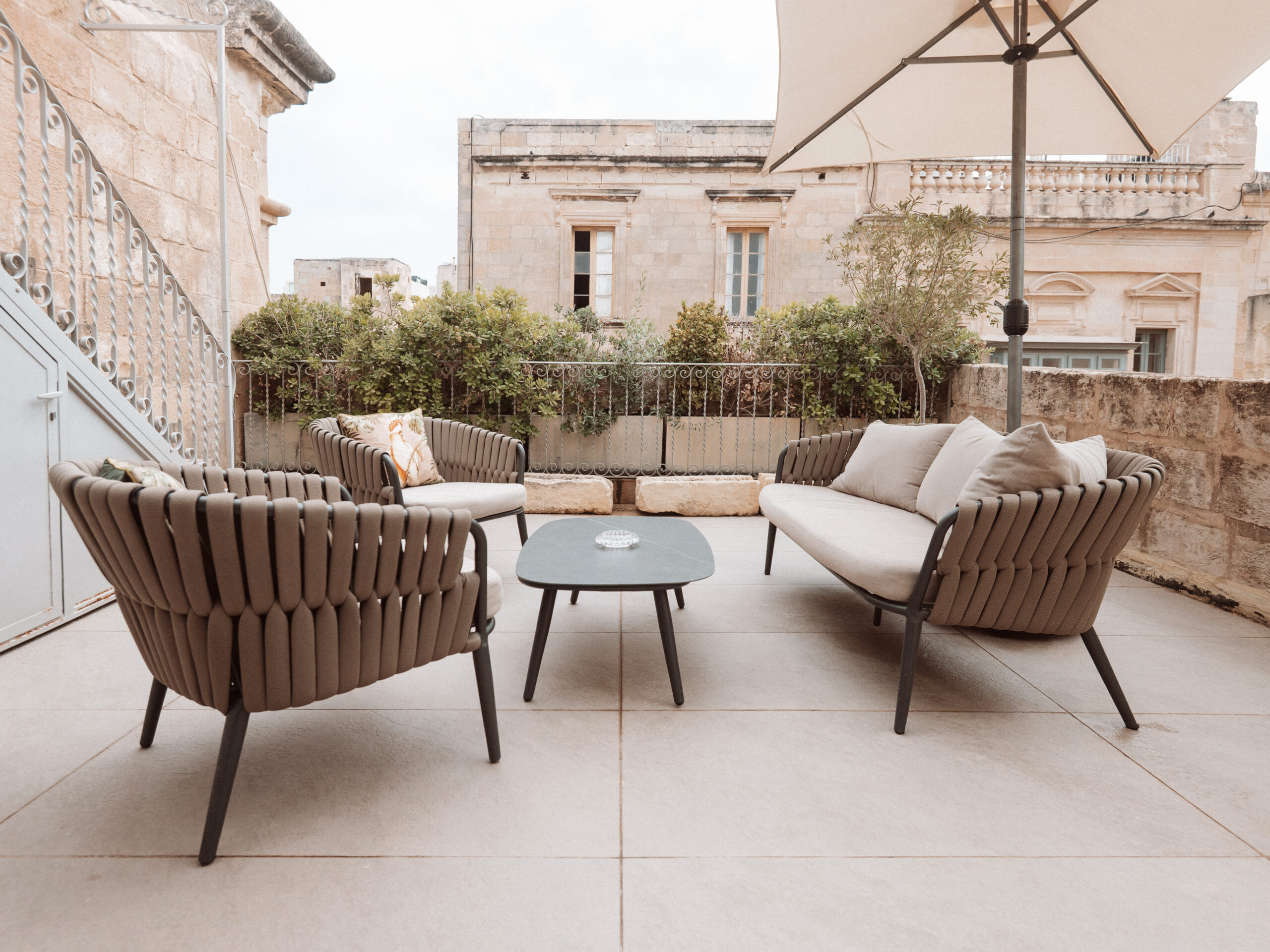 This penthouse deluxe room has been completely renovated to give it a fresh, contemporary feel. The highlight is the outdoor space – with tall glass doors that open onto two large private roof terraces – the top-terrace enjoys a hot tub for four and views of the city and the sea beyond. Inside, this room has been designed with retro sensibility, featuring warm tones, a bright ensuite shower room and a comfortable seating area. This is the perfect space from which to enjoy the beautiful Valletta skyline, including its church dome and sea views.